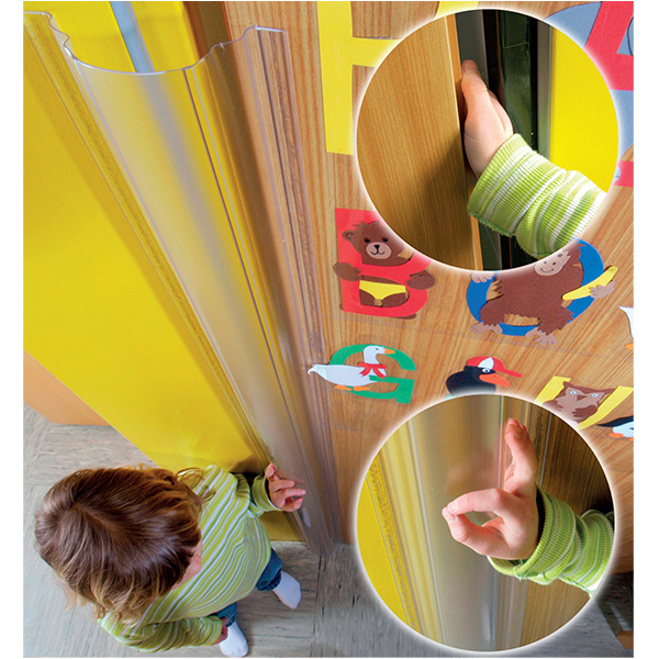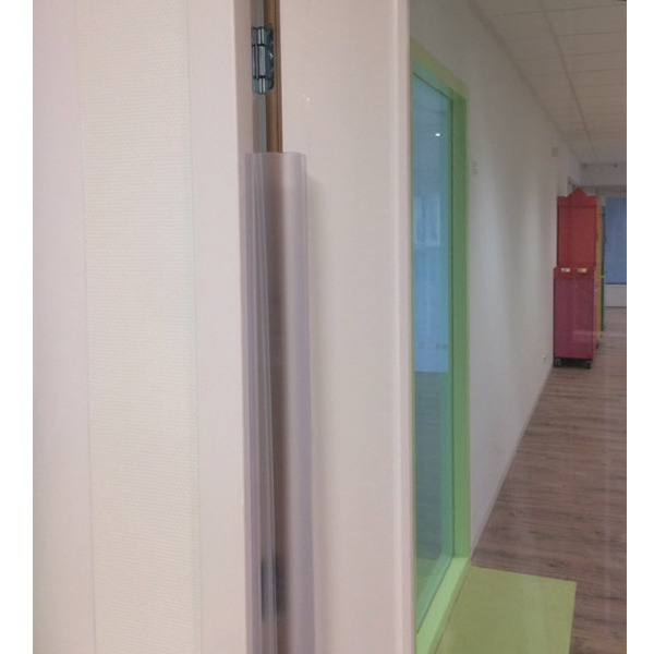 Transparent Fingevakt110º – fingerbeskyttelse som er spesialdesignet for skoler og barnehager. Passer til alle dører og rammer. Dekker døråpninger av dører opp til 5 cm tykkelse og som åpner opp til 110 ° .