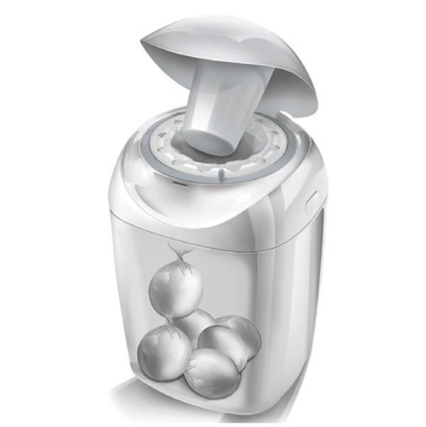 Beholder som pakker og forsegler hver enkelt bleie. Med refilkasett som hindrer bakterier i å spre seg, og dreper 99 % av bakteriene.
