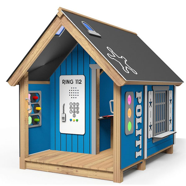 Et lekehus med gode detaljer, designet som en politistasjon. Politistasjonen byr på brukerbetjent trafikklys, et “høyttaleranlegg”, gitter foran vinduene og en skranke inne i huset. Taket er utstyrt med et “utrykningssignal” i blått transparent akrylglass som skaper et dramatisk lys i lekehuset.