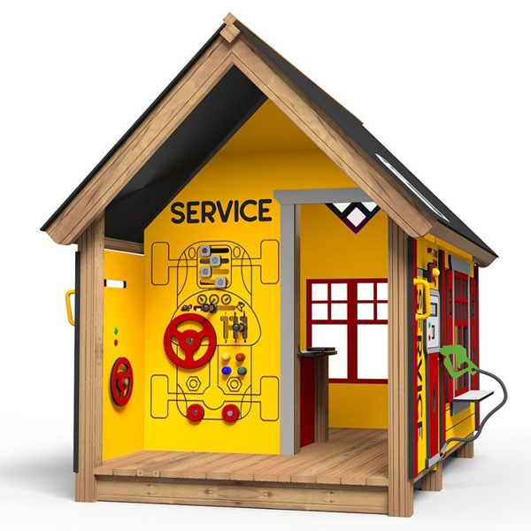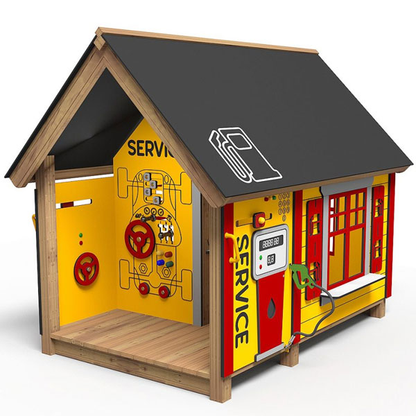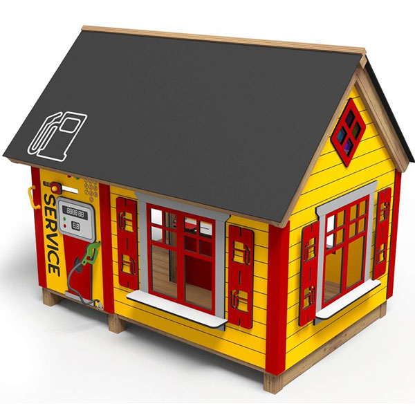 RK8955 Lekehus med gode detaljer, designet som en bensinstasjon. Det inneholder både bensinpumpe og en ladestasjon, dette gjør den tilpasset vår tid. En bil er tegnet opp på ytterveggen slik at barna kan leke med rattet, girstangen, speedometeret og motoren. Dette gir en realistisk og ekte opplevelse for barna. Inne i huset er det en skranke som kompletterer temaet og virkeliggjør leken.