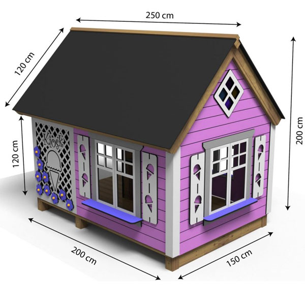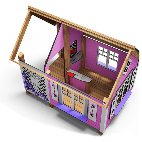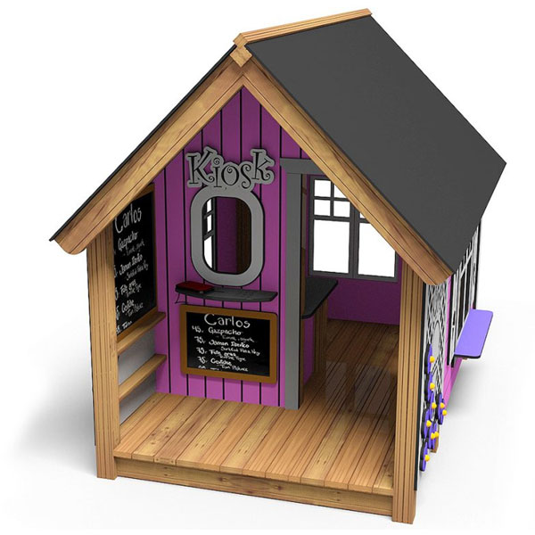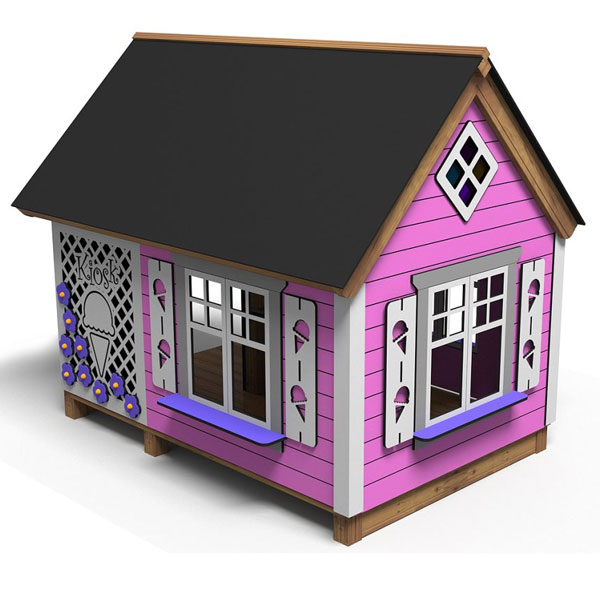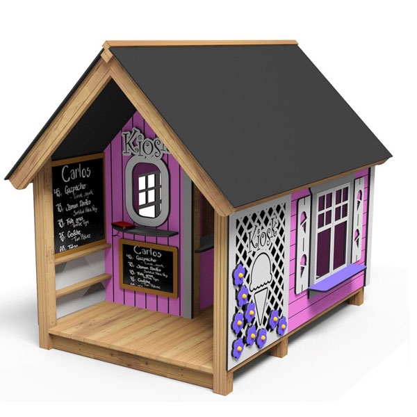 Et lekehus med høy detaljnivå og designet som en kiosk. Lekehuset inneholder en skranke, Bankortterminal, en tavle som salgsskilt, og en skranke inne i huset.
