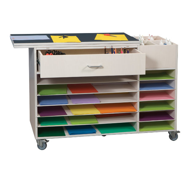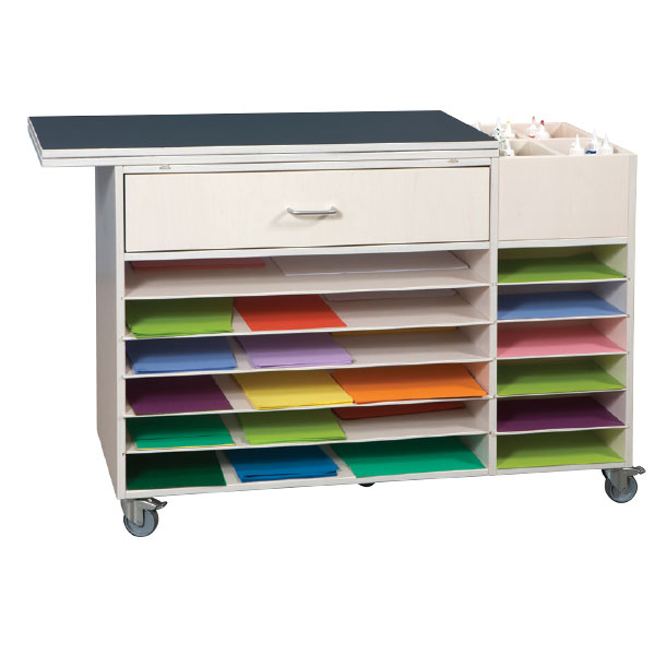 Rom for maleutstyr, hyller til papir, stor skuff og et skap.