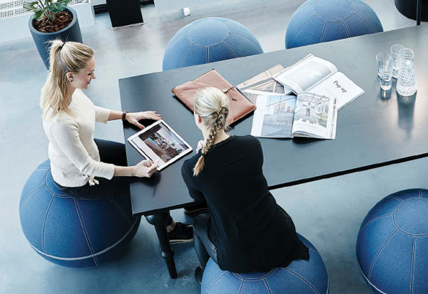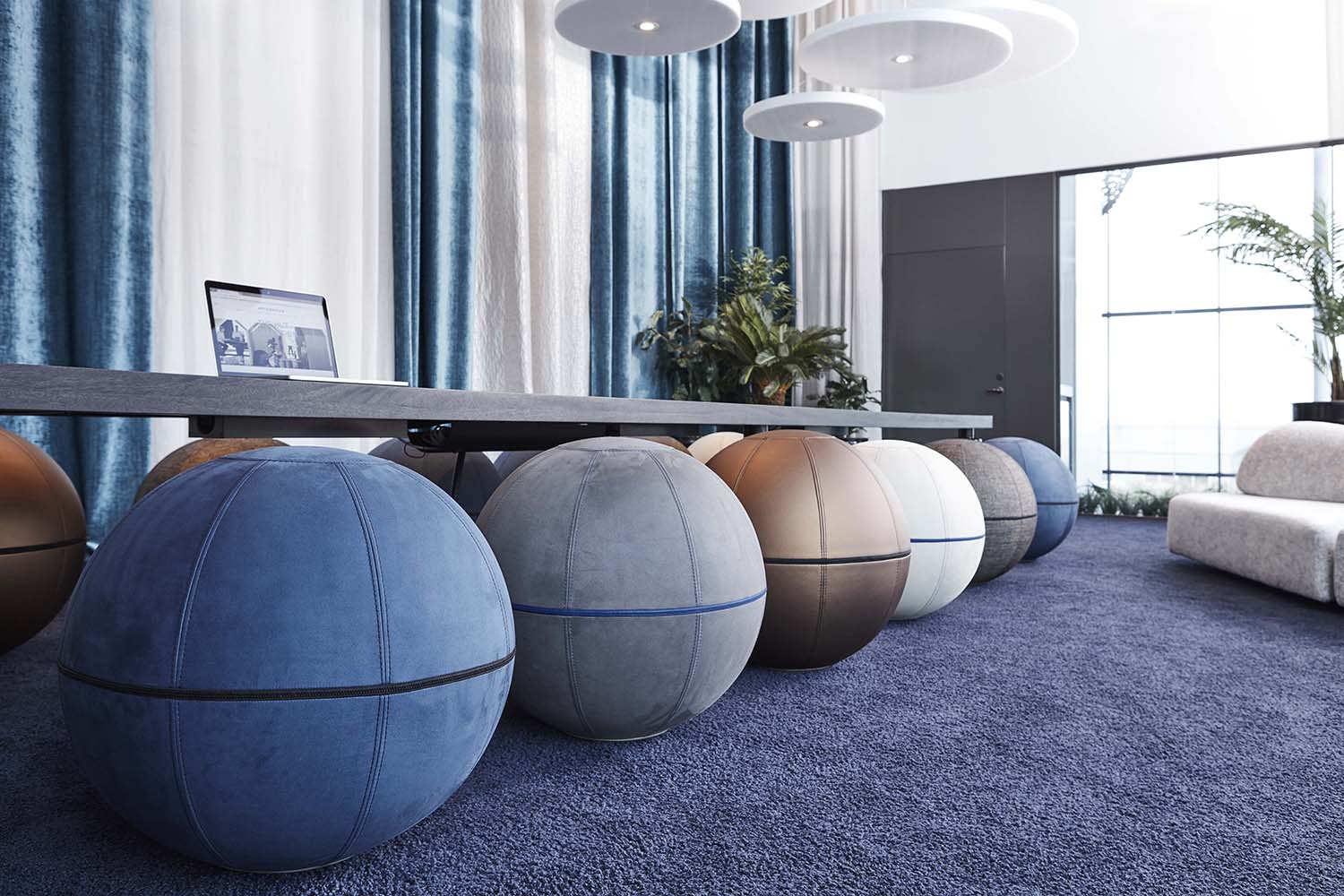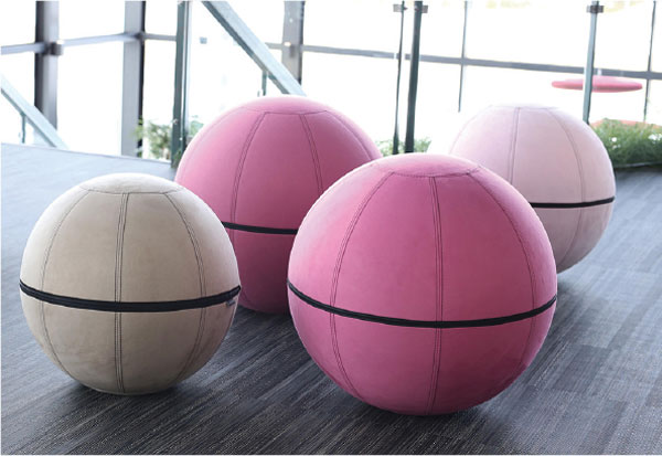 Ergonomisk med innebygd pilates ball, noe som betyr at du må balansere for å sitte oppreist og dermed trene og styrke deler av ryggen,hofter og ben, og få en bedre holdning. Ballen er tilgjengelig i to størrelser med tekstil og glidelås i et bredt spekter. Ballen er regulert med den medfølgende pumpen, har en forsterket bunn og en metallplate for stabilitet.