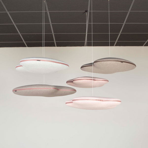 Skyformede takabsorbenter fås i 2 størrelser. Skyene er fylt med lydabsorbent og kledd med skumlaminert stoff for god lydabsorpsjon.
